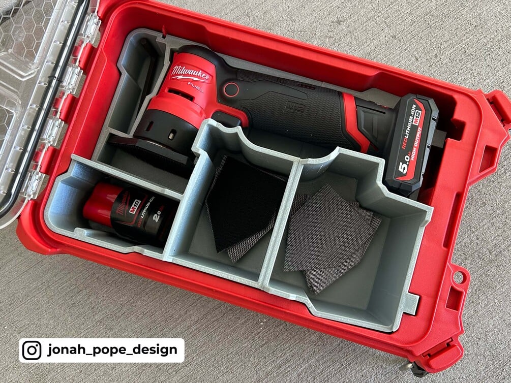 This is a custom insert that I have designed to fit your Milwaukee Packout to store your M12 Detail Sander and accompanying kit. It specifically fits the Milwaukee 48228435 PACKOUT Compact Organiser.