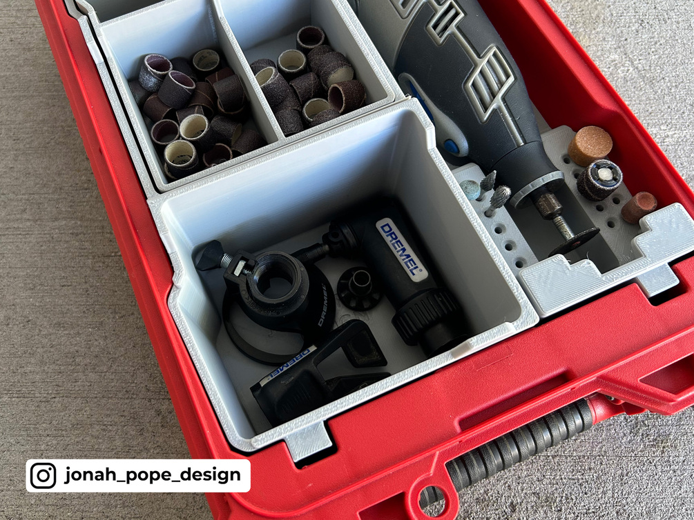 This is a custom insert that I have designed to fit your Milwaukee Packout to store your Cordless Dremel 8220 and accompanying your bits and kit. It specifically fits the Milwaukee 48228435 PACKOUT Compact Organiser.