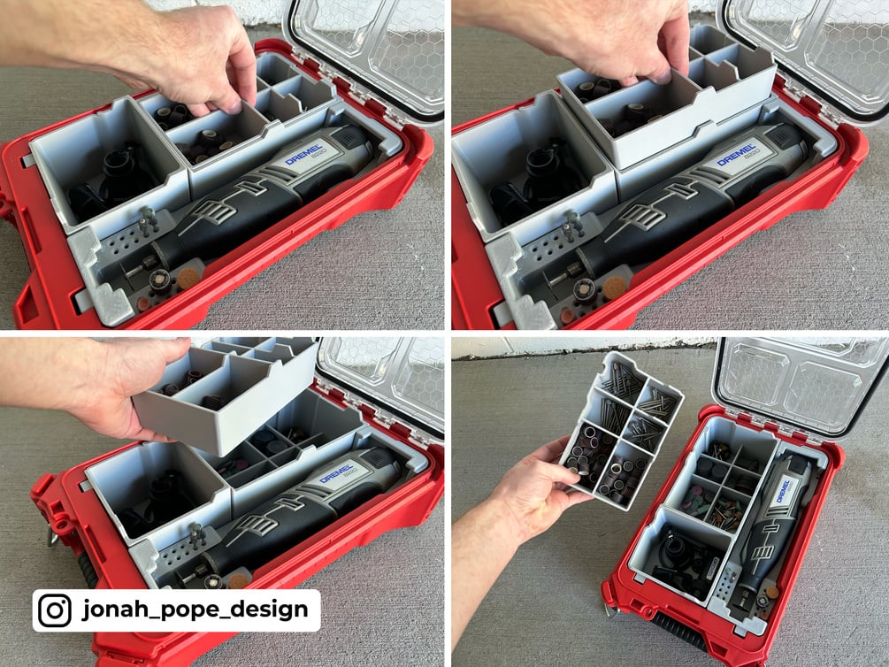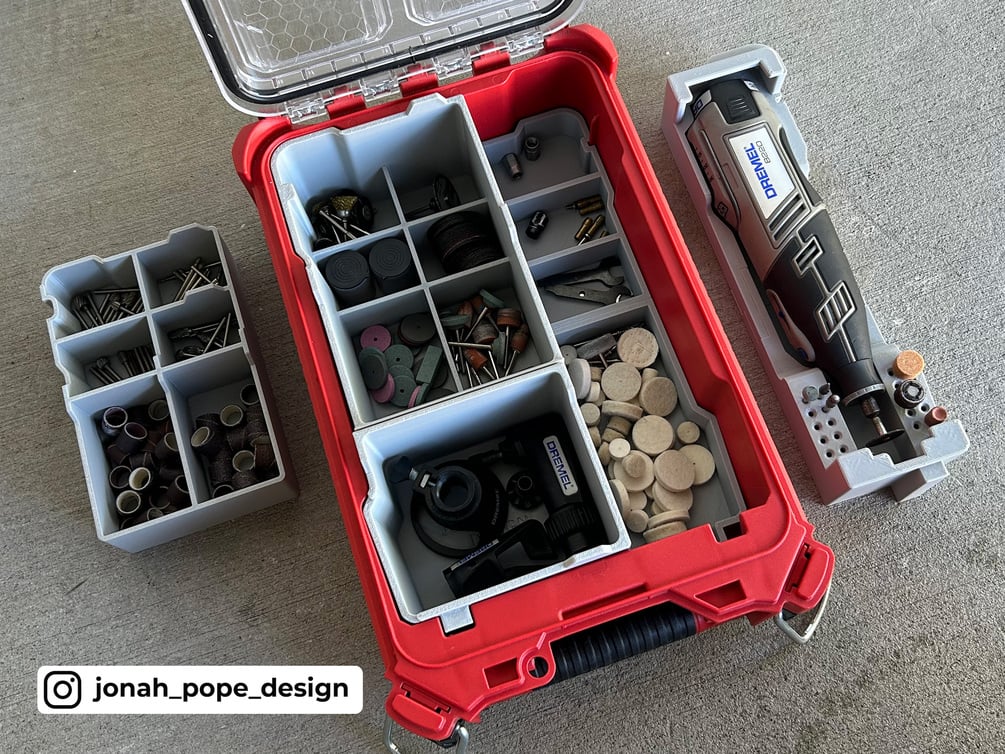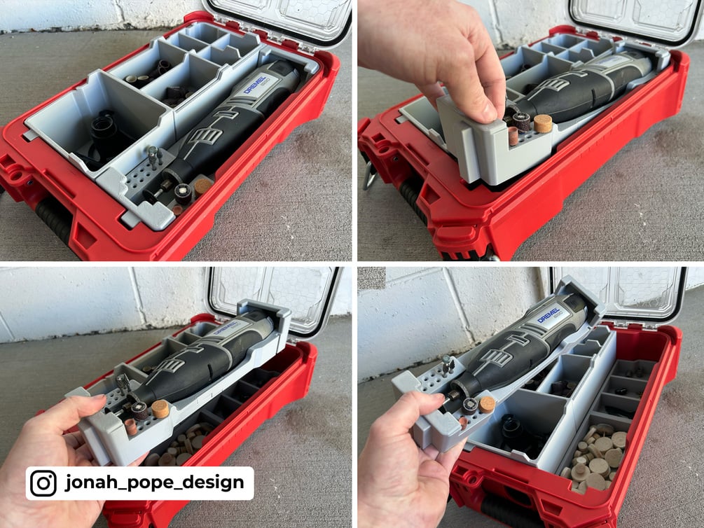 This is a custom insert that I have designed to fit your Milwaukee Packout to store your Cordless Dremel 8220 and accompanying your bits and kit. It specifically fits the Milwaukee 48228435 PACKOUT Compact Organiser.