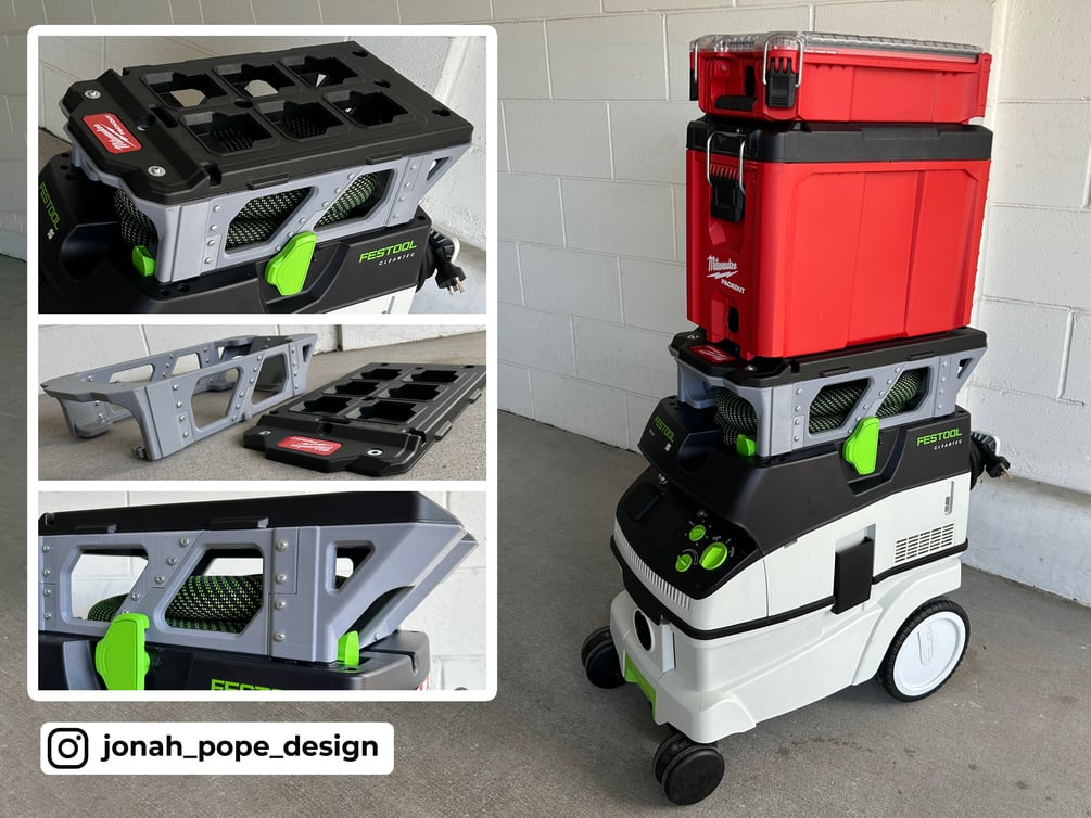 - Perfect Adaptor - You can finally combine your gear! If like me you run Milwaukee but have Festool for your Vac, It's frustrating not being able to store your gear on top. That's what led to me developing this design!