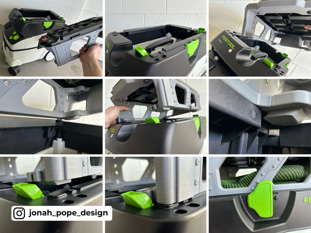 My custom design allows you to mount and stack your Packout on top of your Festool Vacuum Cleaner Dust Extractors! The print is designed to mount and interlock to the Vac using the pre-existing Systainer clips. Then simply bolt on the Compact Packout Mounting plate to the top of the print for stacking your Packout!