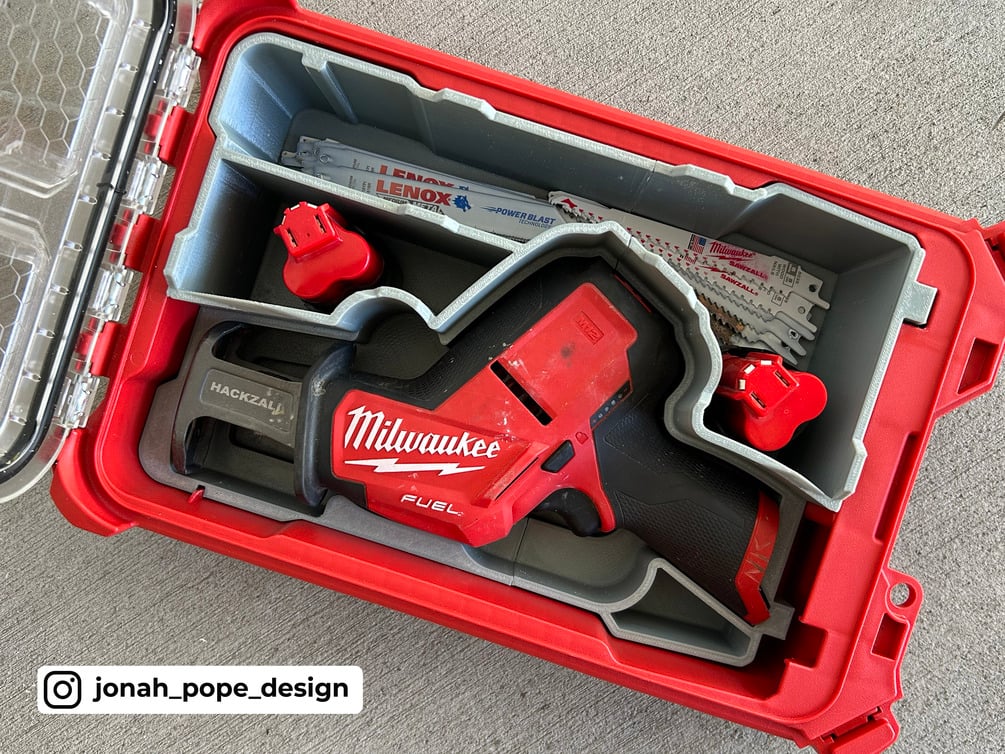 This is a custom insert that I have designed to fit your Milwaukee Packout to store your M12 Hackzall and accompanying kit. It specifically fits the Milwaukee 48228435 PACKOUT Compact Organiser.