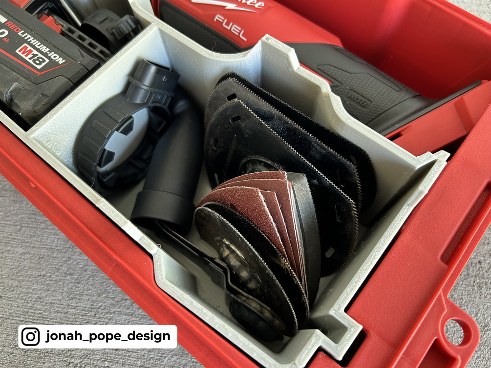 This is a custom insert that I have designed to fit your Milwaukee Packout to store your M18 Multi-tool and accompanying kit. It specifically fits the Milwaukee 48228435 PACKOUT Compact Organiser.