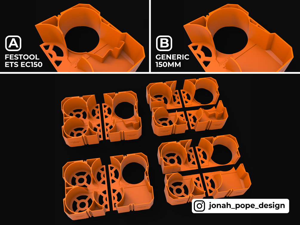 File Set 002 - Generic Sanders - The Festool specific sections have been removed allowing you to store other brands of 150mm Orbital Sanders. Due to the large variety of designs/shapes available for 150mm Orbital sanders, I cannot make any guarantees whether your sander will fit. I did however want to ensure the option was available. If it can fit in the toolbox upright, there's a chance it will be suitable.
