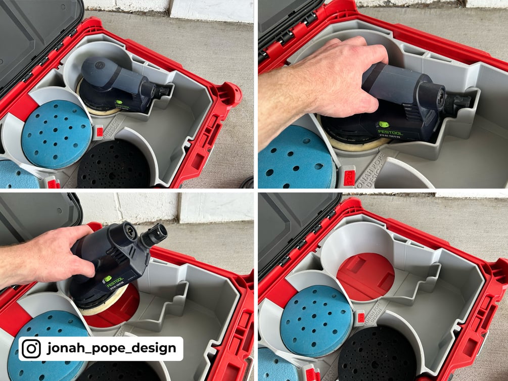 - Efficient Storage - Store and sort your 150mm orbital sanding pads like never before! 4 dedicated spots are available for all your storage needs. Additional tub storage is available surrounding the 4 slots for your smaller items.
