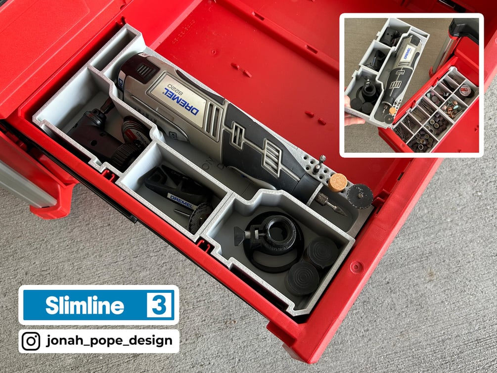 - Multilayered Storage - The design consists of two layers, a bottom layer to store all your Dremel bits and supplies, and a top later that stores your tool and extra attachments! The top layer simply drops in on top of the bottom layer and sits in place thanks to tabs I've designed into the parts.