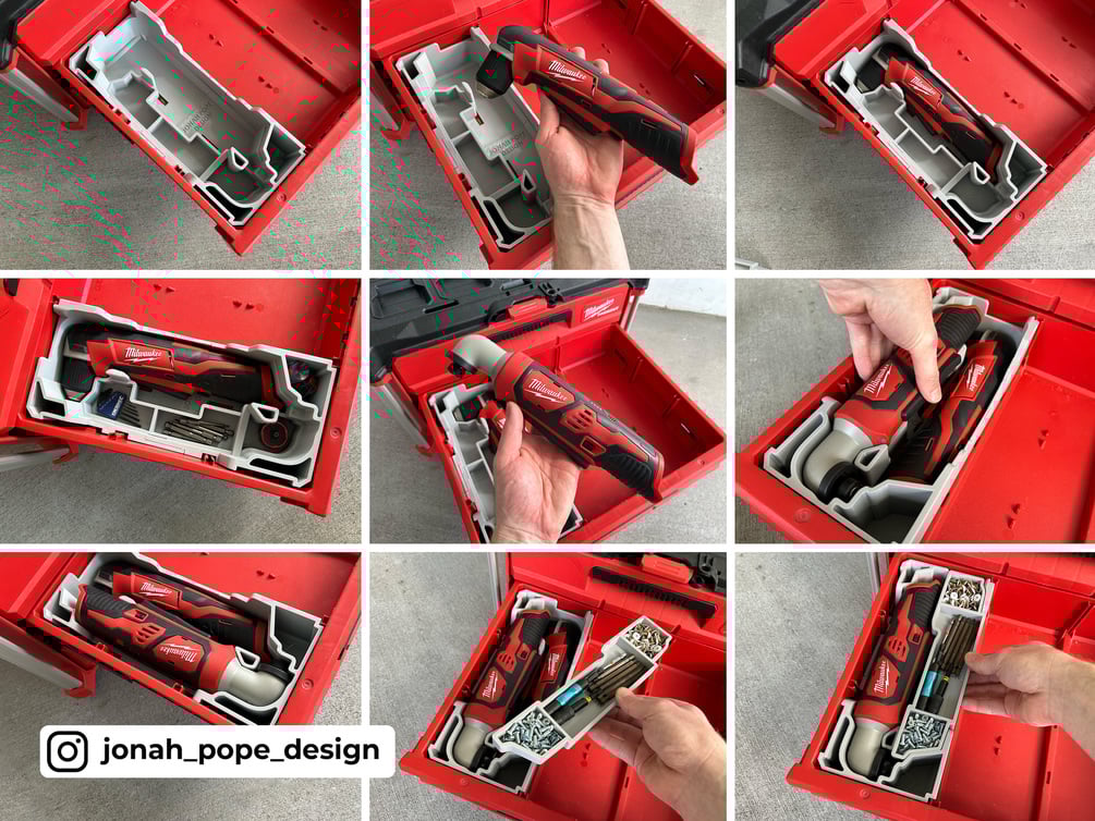This is a custom insert that I have designed to fit your Milwaukee Packout Drawers to store your M12 Angle Drill (C12RAD-0) & Angle Impact (M12BRAID-0) . It specifically fits the Milwaukee 2 & 3 Drawer units (48-22-8443 & 48-22-8442).