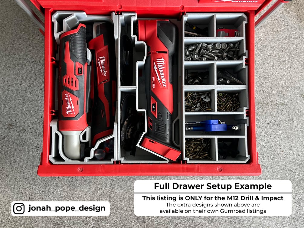 This is a custom insert that I have designed to fit your Milwaukee Packout Drawers to store your M12 Angle Drill (C12RAD-0) & Angle Impact (M12BRAID-0) . It specifically fits the Milwaukee 2 & 3 Drawer units (48-22-8443 & 48-22-8442).